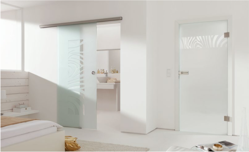 Die Sandstrahlung erzeugt eine dezent mattierte Oberflächenveredelung. Durch die gesandstrahlten Flächen im Motiv wird eine besondere Lichtwirkung im Raum erzeugt. Auf Grund der technischen Umsetzungen können auch ganz individuelle Motive nach Kundenwunsch auf das Glas gebracht werden. Die hochwertige GEWE-clean-Nanobeschichtung versiegelt die Oberfläche und sorgt so für eine pflegeleichte Glastür.