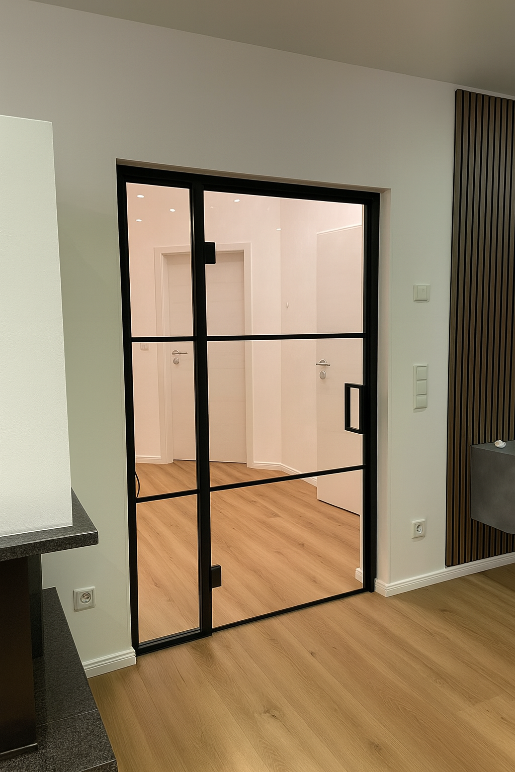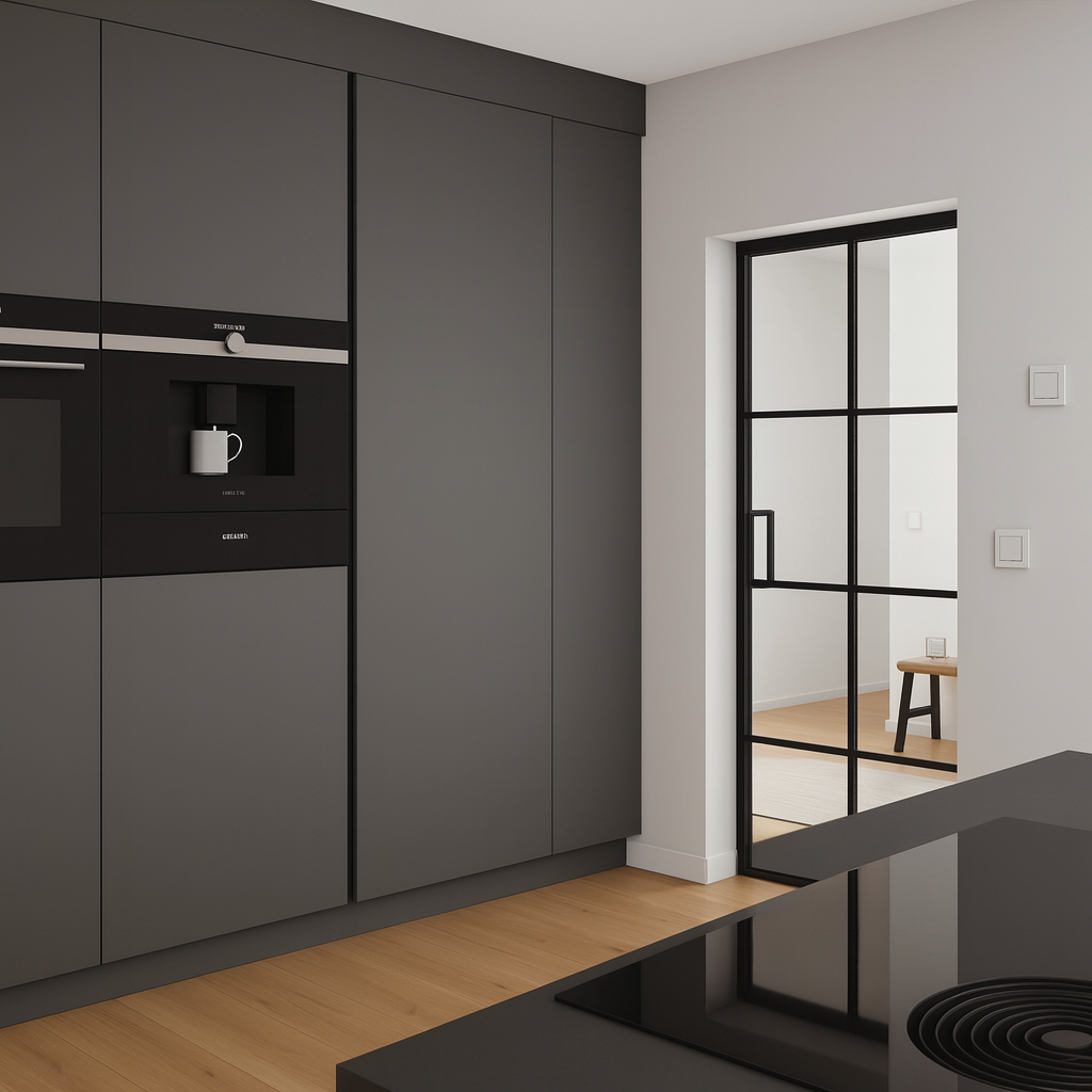 Mit einseitiger Öffnung führt sie Bewegungen eindeutig; ohne Selbstschließer bleibt sie in der gewünschten Position – leise, kontrolliert, ohne Eile. Der schlanke Rahmen hält die Optik aufgeräumt, ordnet Fugen und Anschlüsse und lässt Linien sauber wirken.